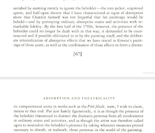 Every aspiring novelist, and readers too, learned the grammar of emotional prose, the key words and scenarios which were to trigger certain feelings; painting seems to have been similarly afflicted. The shift Fried details in the excerpt below (sorry about the Google Books screen shots) gets at how representations of reflexivity can become suddenly loaded and problematic for a society. The ability to let go of oneself can be reified and neutralized, circumscribed -- or it may be glamorized and disseminated as an ideal.